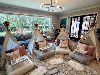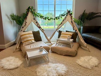 Each of our teepees measures approximately 4 feet tall and requires about 3 feet of width once set up. We recommend allowing enough open space in your home or venue to comfortably fit the number of teepees you’d like.